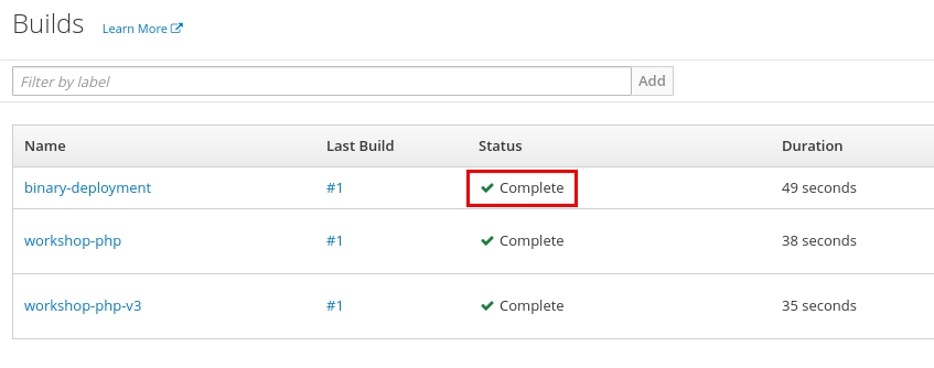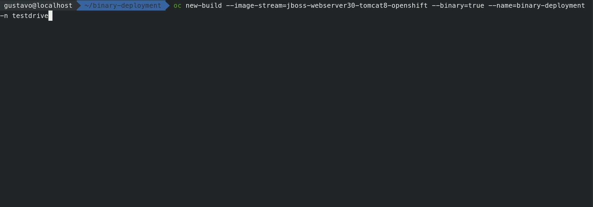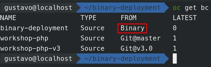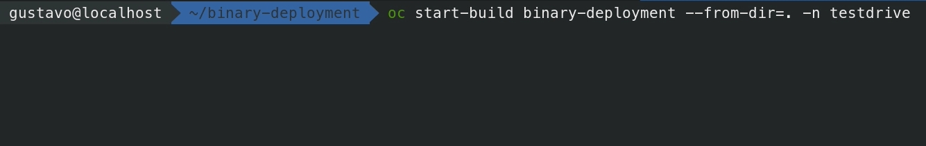 --name=binary-deploymentEsse comando irá criar um BuildConfig que nada mais é que um arquivo descritor explicando como o Openshift deve construir a imagem docker. O detalhe nesse caso é o parametro --binary=true. Ele instrui que o BuildConfig use o binário ao invés do código-fonte da aplicação.