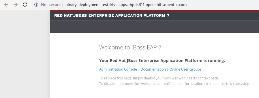 oc start-build binary-deployment --from-dir=.Estamos passando nesse comando qual o diretório que queremos enviar para a imagem do JBoss EAP 7. Nesse caso, é o diretório atual. A imagem do JBoss EAP sabe que deve pegar os arquivos que estão dentro da pasta deployments e jogar na pasta do JBoss responsável pelo deployment.