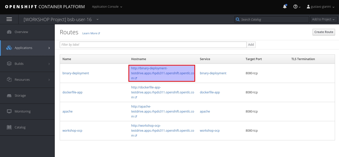 oc expose svc binary-deploymentEsse comando expõe o seu app, criando uma rota para o mesmo. A url gerada pode ser conferida em Applications > Routes